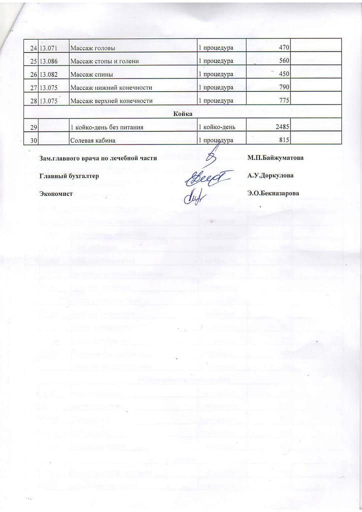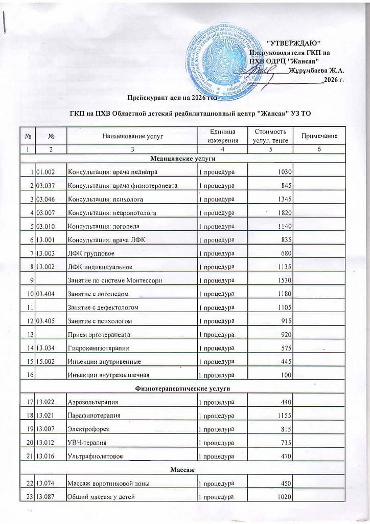 1 Перечень платных услуг с указанием стоимости ГКП на ПХВ «Областной детский реабилитационный центр «Жансая» УОЗ ТО 30
