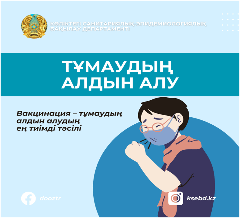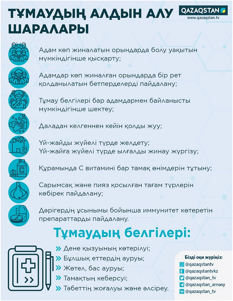 Тұмауға қарсы тиімді әдіс – ВАКЦИНАЦИЯ болып табылады. Өз уақытында вакцинациялану тұмауға бірнеше рет шалдығуды азайтады, аурудың ұзақтығын қысқартады және асқынулардың алдын алады. Вакцинациядан басқа, ағзаның қорғанысын арттыру ұсынылады: дене шынықтырумен айналысу, дұрыс тамақтану, демалу және витаминді-минералды кешендерді пайдалану. Сондай-ақ, тұмауға ұқсас симптомдары бар адамдармен тығыз байланыста болмау, бөлмені жиі желдету, шамадан тыс тоңу және қызып кетуден аулақ болу. Профилактикалық шараларды сақтасаңыз, Сізді тұмау ауруынан және оның жағымсыз әсерінен қорғайтынын, есте сақтаңыз.