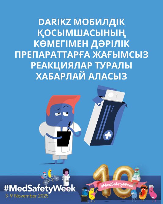 Дәрілік заттардың қауіпсіздігі өзіңізден басталады. Сіз пациент болсаңыз да, медицина қызметкері немесе денсаулық сақтау саласының өкілі болсаңыз да – әрқайсыңыз дәрілік заттардың қауіпсіздігін арттыруға өз үлесіңізді қоса аласыз. Белсенді болыңыз – дәрілік заттарды қолданғаннан кейін байқалған күдікті жағымсыз әсерлер туралы өз дәрігеріңізге немесе Дәрілік заттарды сараптау ұлттық орталығына хабарлаңыз. #MedSafetyWeek |